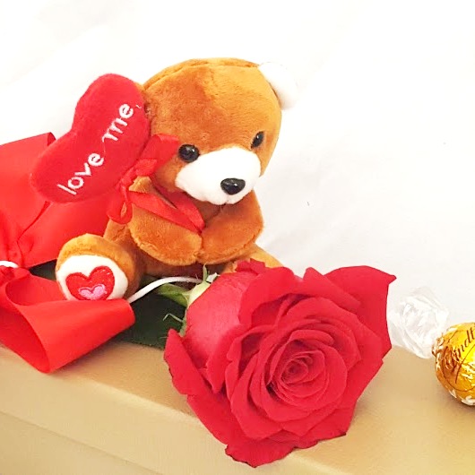Stunning Single Rose presented in a long box grouped with a cute teddy luscious chocolate and a Valentines Card.